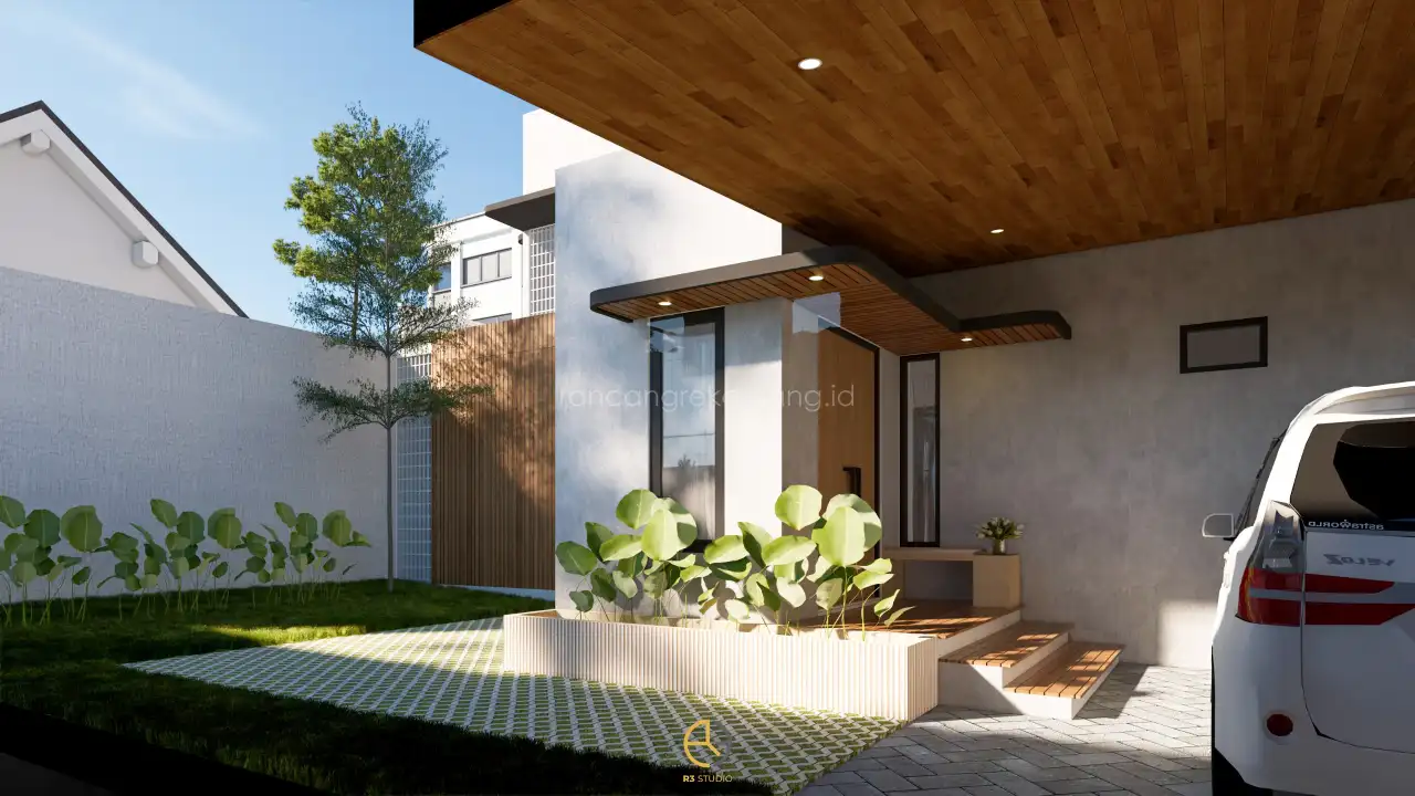 Sebagai arsitek Jogja, kami terbiasa menghadapi tantangan lahan tropis dengan karakter unik. Salah satunya pada proyek ini, yang menghadap ke arah barat dan berada tepat di pinggir jalan desa. Oleh karena itu, untuk menjaga kenyamanan termal dan privasi, kami merancang secondary skin di fasad lantai dua. Elemen ini berfungsi menyaring cahaya sore serta melindungi penghuni dari pandangan luar.